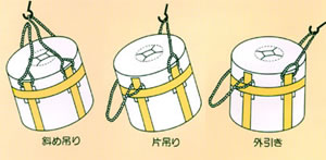 - 工場内運搬には出来るだけパレットを使用し、フックで吊ったままでコンテナを振りながら走行しないでください。